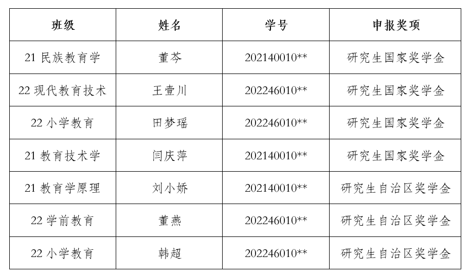 依据《新葡萄88805官网研究生奖学金评选办法》(校发[2022]54号)和《关于做好2023年度研究生各类奖学金评审及材料报送工作的通知》文件精神,经过学生申请、班级推荐以及学院公开答辩,拟推荐以下学生分别申报研究生国家奖学金和研究生自治区奖学金。